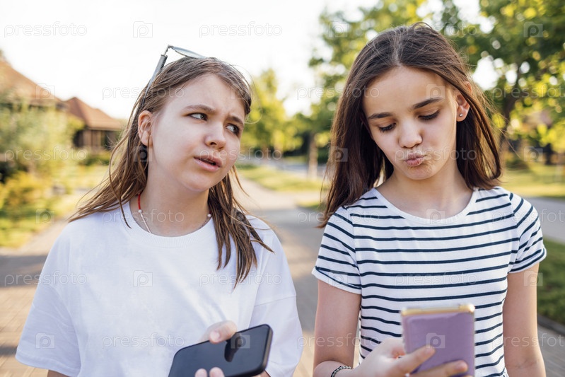Две девочки-подростка идут по улице и болтают летом