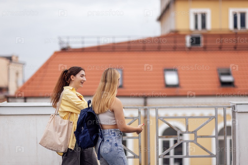 Две милые девочки-подростки болтают и гуляют вместе. Забавные студенты в повседневной одежде с рюкзаками разговаривают и смеются на крыше дома