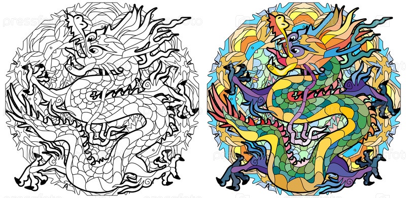 Зентангл дракона в стиле мандалы для раскрашивания, дизайна футболок, татуировок и других украшений. Набор цветов и контуров
