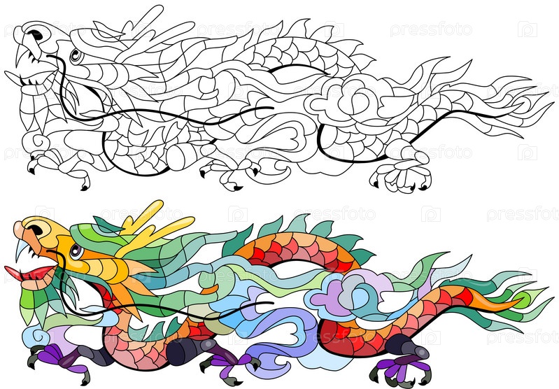 Дракон в стиле зентангл для раскрашивания, дизайна футболок, татуировок и других украшений. Набор цветов и контуров