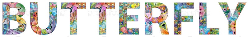 Ручная роспись художественного дизайна. Нарисованное вручную иллюстрационное слово БАБОЧКА для дизайна футболок и других украшений