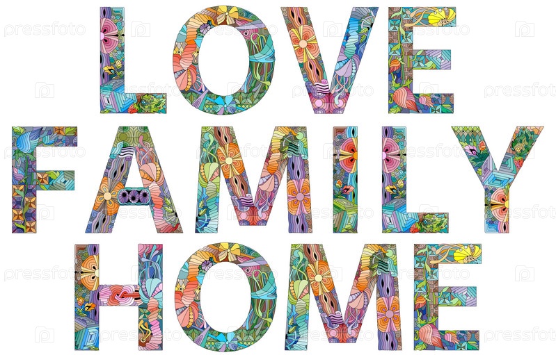 ЛЮБОВЬ СЕМЬИ ДОМ рисованной надписи. Плакат, открытка, приглашение и баннер ко Дню Святого Валентина