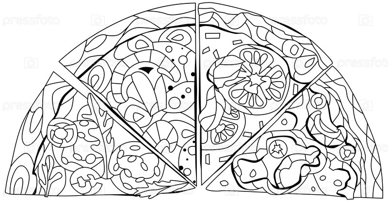 Ломтики пиццы в декоративном стиле на белом фоне. Изолированная векторная иллюстрация. Набор иконок ресторана для раскраски. Половина пиццы, состоящая из четырех ломтиков. Приготовление фона
