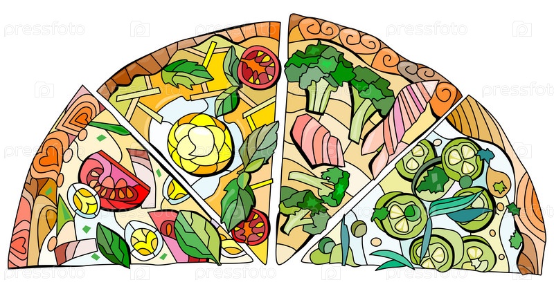 Ломтики пиццы в декоративном стиле на белом фоне. Изолированная векторная иллюстрация. Набор иконок ресторана. Половина пиццы, состоящая из четырех ломтиков. Приготовление фона