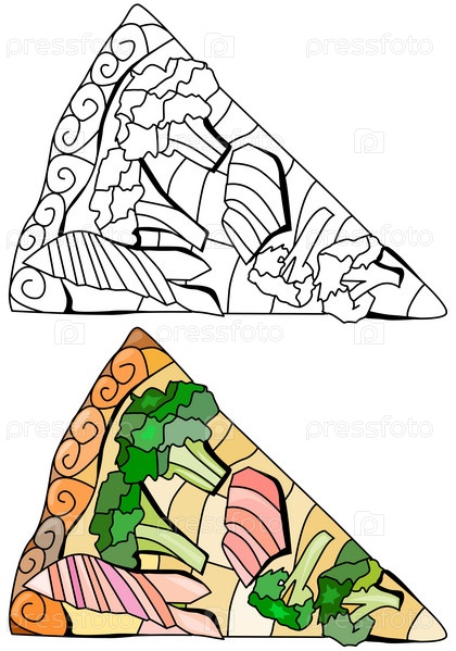 Кусочек пиццы в декоративном стиле на белом фоне для окраски. Изолированная векторная иллюстрация. Набор иконок ресторана. Векторная иллюстрация фона. Набор цветов и контуров