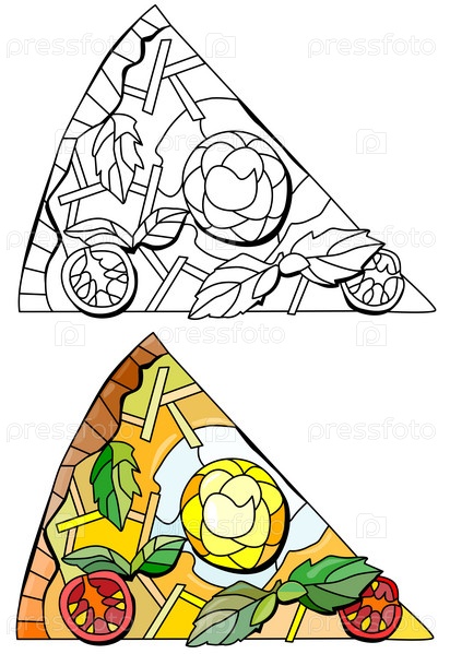 Кусок пиццы, декоративная векторная иллюстрация для раскраски. Набор цветов и контуров
