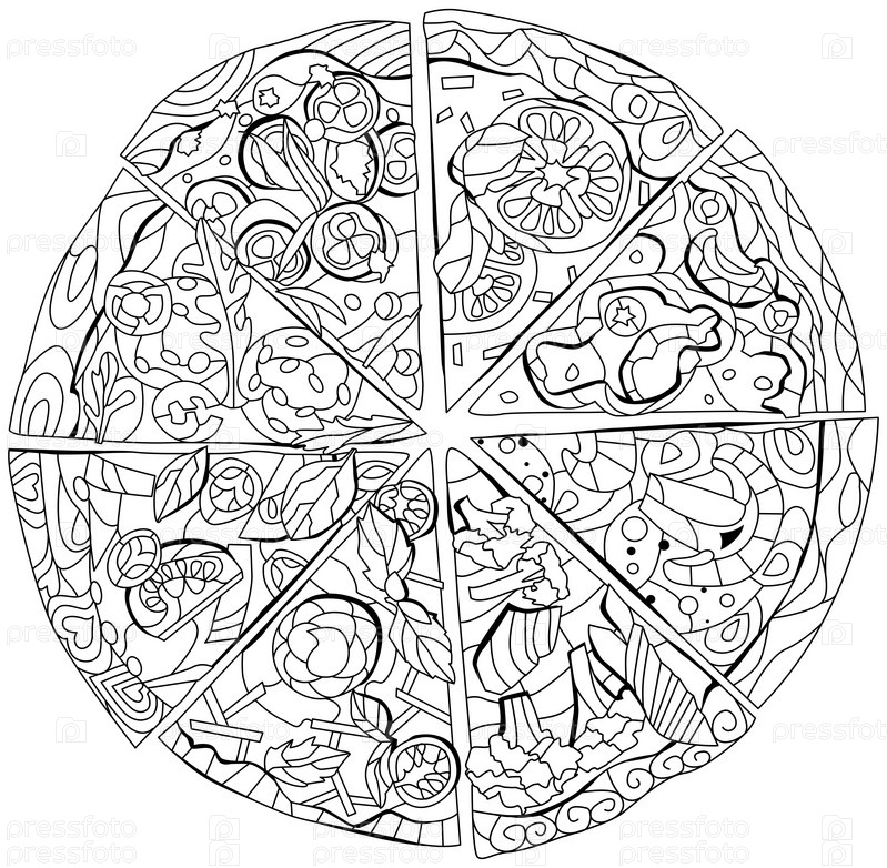 Набор ломтиков пиццы, декоративная векторная иллюстрация для раскраски