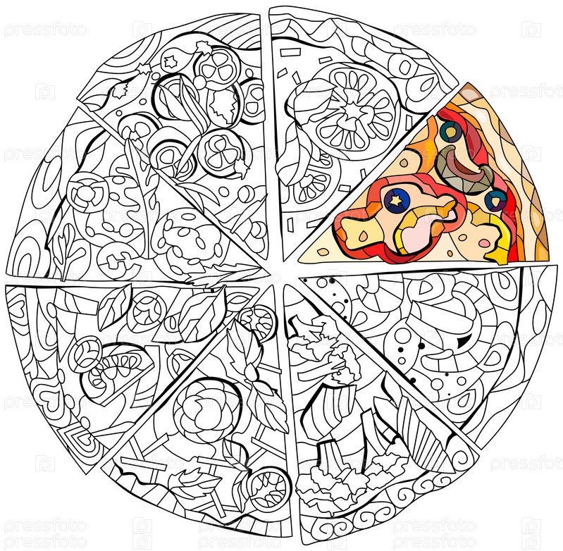 Набор ломтиков пиццы, декоративная векторная иллюстрация для раскраски. Набор цветов и контуров