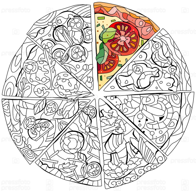 Набор ломтиков пиццы, декоративная векторная иллюстрация для раскраски. Набор цветов и контуров