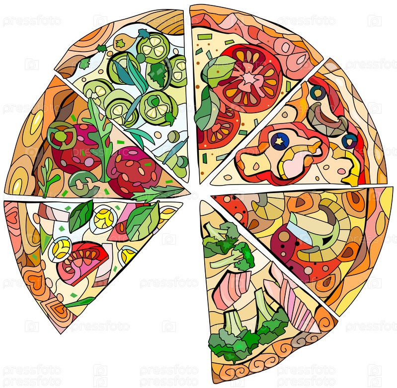 Ломтики пиццы в декоративном стиле на белом фоне. Изолированная векторная иллюстрация. Набор иконок ресторана. Пицца, состоящая из семи ломтиков