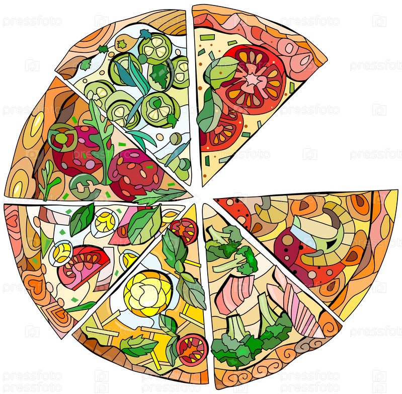 Набор кусочков пиццы, декоративная векторная иллюстрация в стиле zentangle