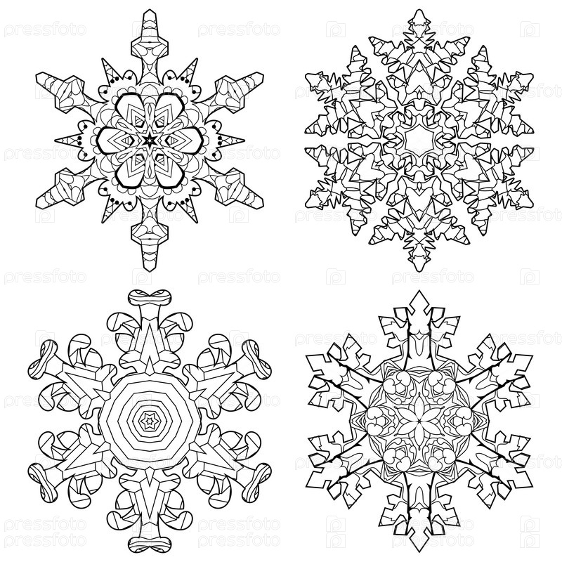 Набор зимних снежинок. Ручная рисованная декоративная векторная иллюстрация для раскраски