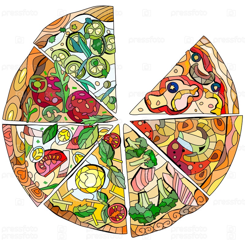 Набор кусочков пиццы, декоративная векторная иллюстрация в стиле zentangle