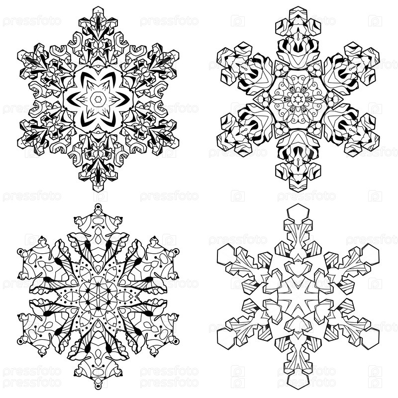 Набор зимних снежинок. Ручная рисованная декоративная векторная иллюстрация для раскраски