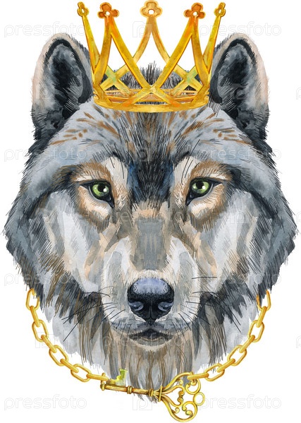 Портрет волка в золотой короне и с золотой цепью. Иллюстрация акварели серого волка. Красивый мир дикой природы