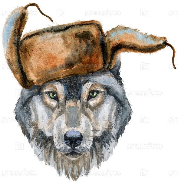 Портрет волка в шапке-ушанке. Иллюстрация акварели серого волка. Красивый мир дикой природы