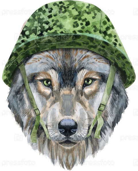 Портрет волка в военно-тактическом шлеме. Иллюстрация акварели серого волка. Красивый мир дикой природы