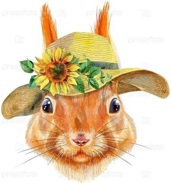 Акварельная ручная иллюстрация лица белки. Портрет рыжей белки в летней шляпе