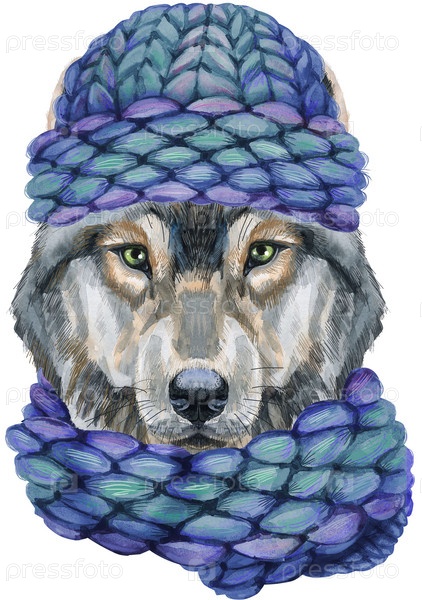 Портрет волка в синей зимней вязаной шапке и шарфе. Иллюстрация акварели серого волка. Красивый мир дикой природы
