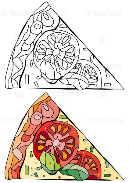 Кусочек пиццы в декоративном стиле на белом фоне. Изолированная векторная иллюстрация. Набор иконок ресторана. Векторная иллюстрация фона. Кулинарный фон. Набор цветов и контуров