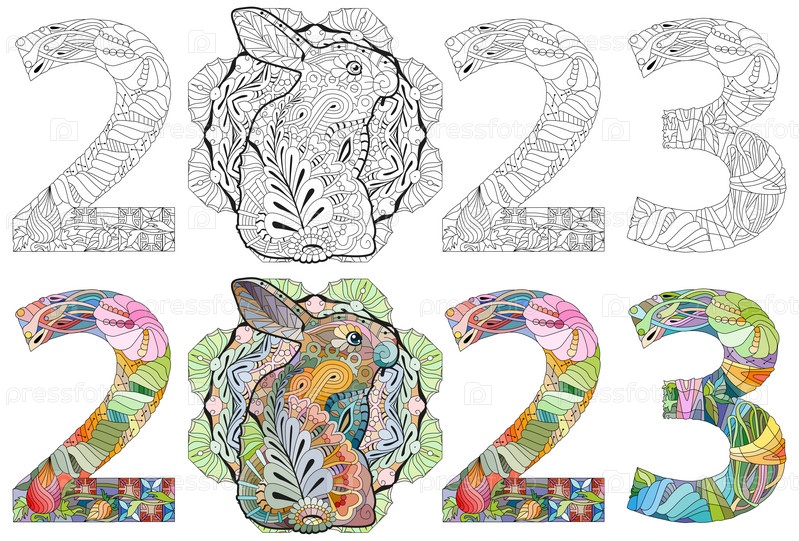 Нарисованный вручную зентангловый кролик номер 2023 для раскраски, футболки и других украшений. Цвет и контур