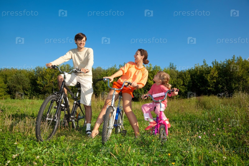 Семья из трех человек на велосипедах в парке в солнечный день