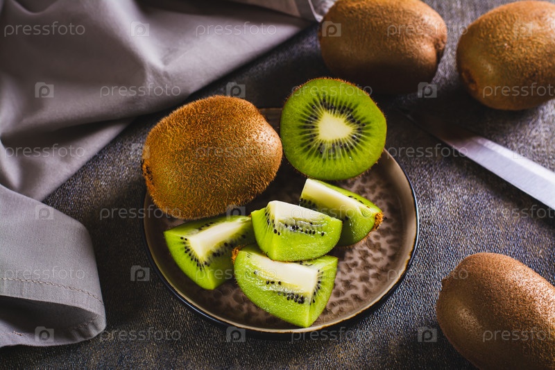 Спелые нарезанные киви и целиком на тарелке на столе