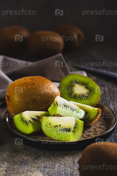 Свежие спелые нарезанные киви на тарелке на столе, вертикальный вид