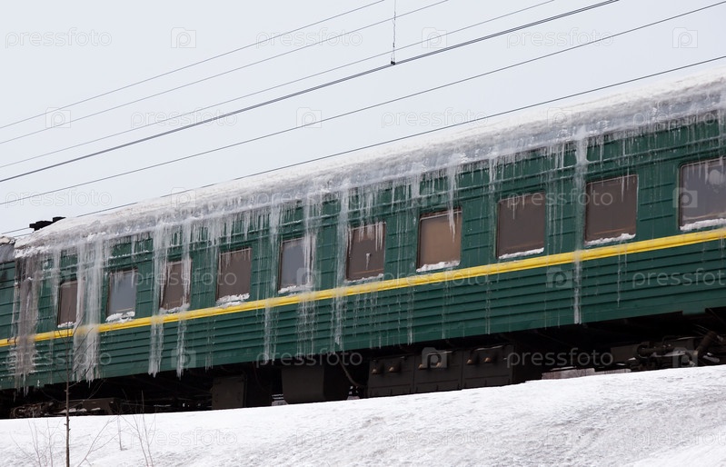 Пассажирский поезд, покрытый льдом