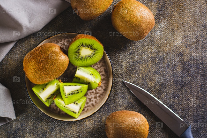 Свежие спелые нарезанные киви на тарелке, вид сверху стола
