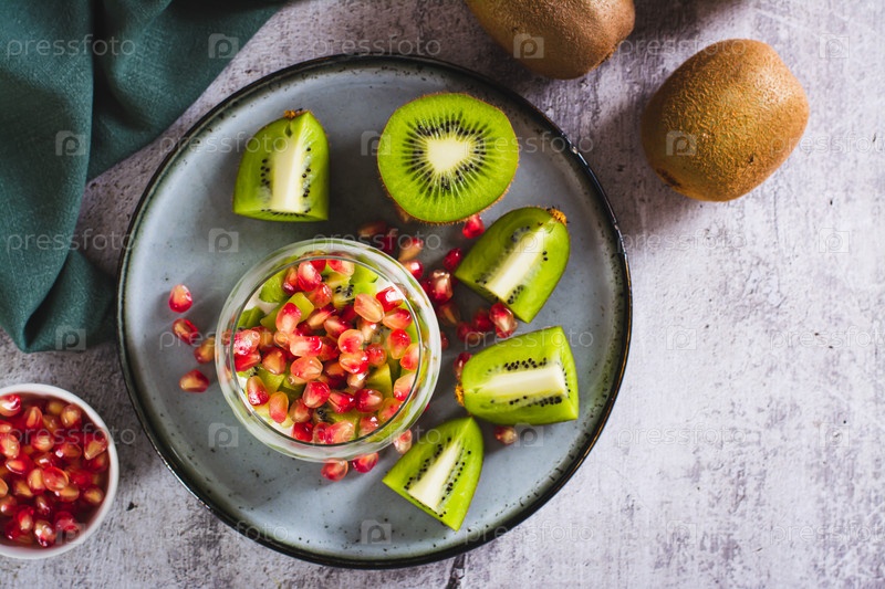 Свежий греческий йогурт с кусочками киви и семенами граната в стакане на столе