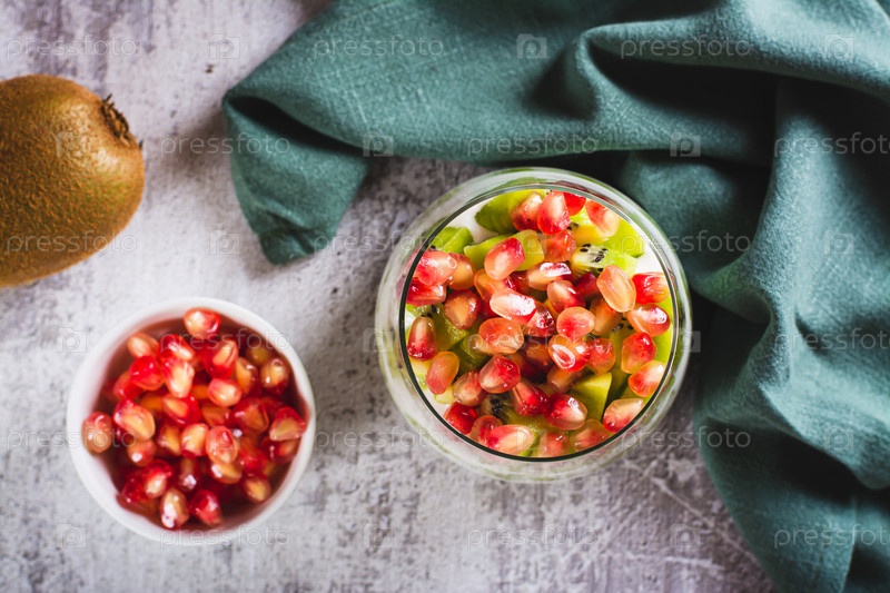 Крупный план свежего греческого йогурта с кусочками киви и зернами граната в стеклянном виде сверху