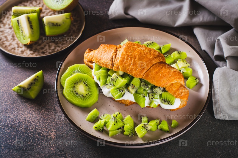 Круассан-сэндвич с киви и йогуртом на тарелке на столе