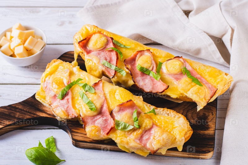 Багет, запеченный с ветчиной, сыром и базиликом на деревянной доске