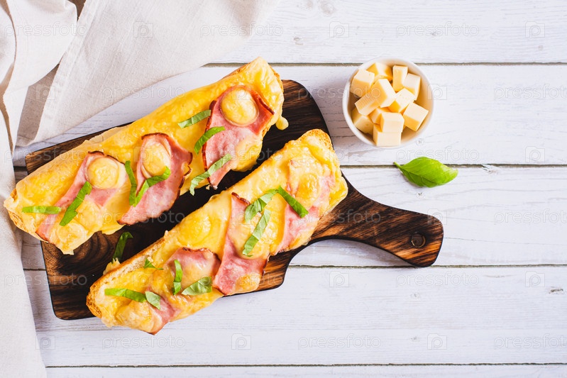 Запеченный багет с беконом, сыром и зеленью на доске, вид сверху стола