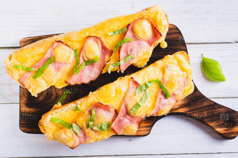 Крупный план запеченного багета с беконом, сыром и зеленью на доске на столе
