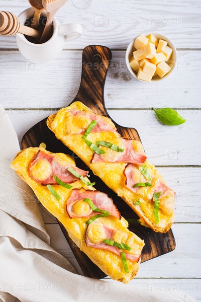 Багет, запеченный с ветчиной, сыром и базиликом на деревянной доске и вертикальный вид