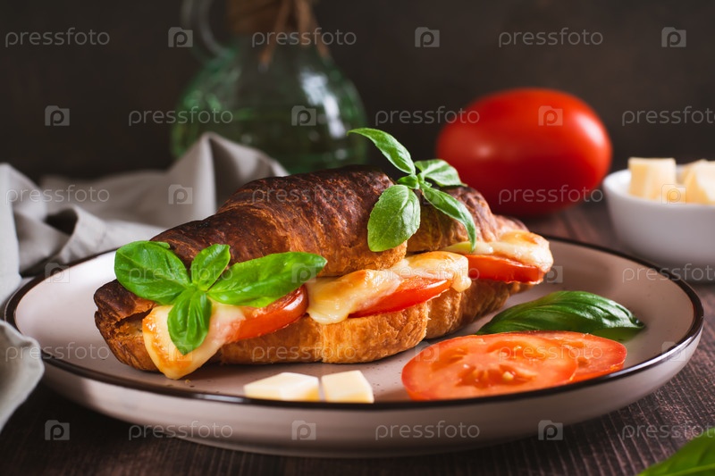 Сэндвич с круассаном капрезе, запеченный с помидорами и сыром на тарелке