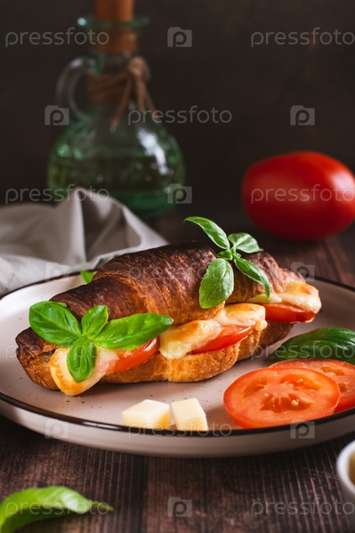 Сэндвич с круассаном капрезе, запеченный с помидорами и сыром на тарелке, вертикальный вид
