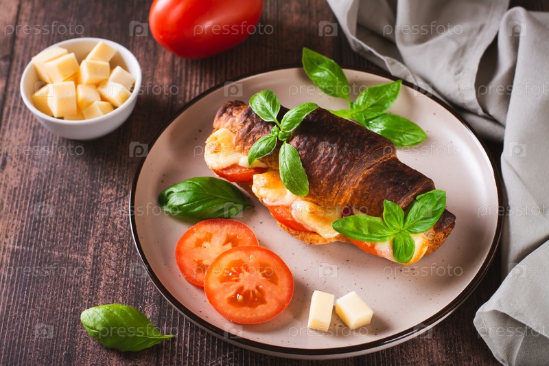 Запеченный круассан капрезе с помидорами, сыром и базиликом на тарелке