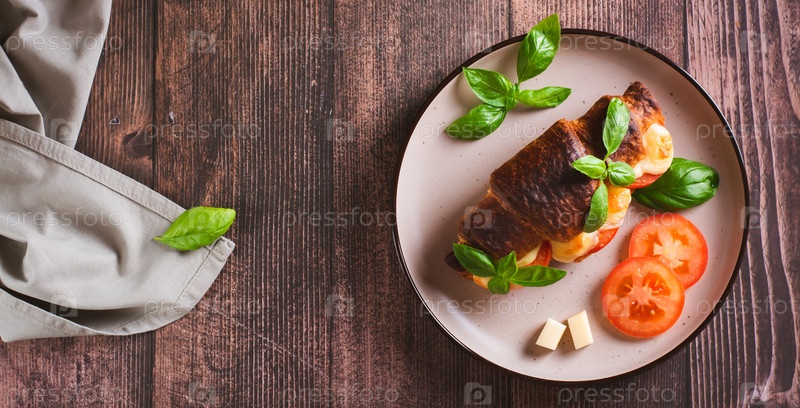 Запеченный круассан капрезе с помидорами, сыром и базиликом на тарелке, вид сверху, веб-баннер