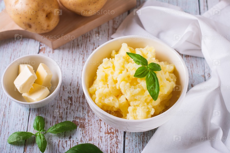 Чаша с вкусным домашним картофельным пюре и базиликом на столе
