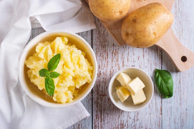 Свежее картофельное пюре и листья базилика в миске на столе, вид