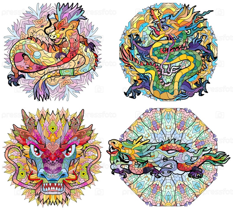 Драконы на мандалах в стиле зентангл для дизайна футболок, татуировок и других украшений