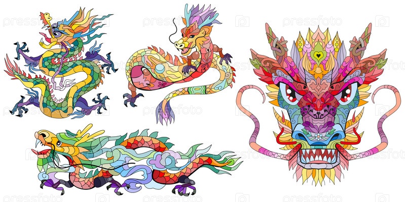 Драконы в технике дзентангл. Ручная рисованная декоративная векторная иллюстрация