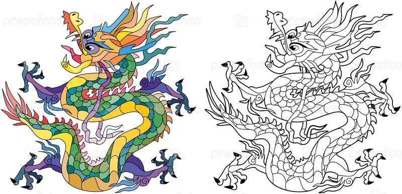 Дракон в стиле зентангл для раскрашивания, дизайна футболок, татуировок и других украшений. Набор цветов и контуров