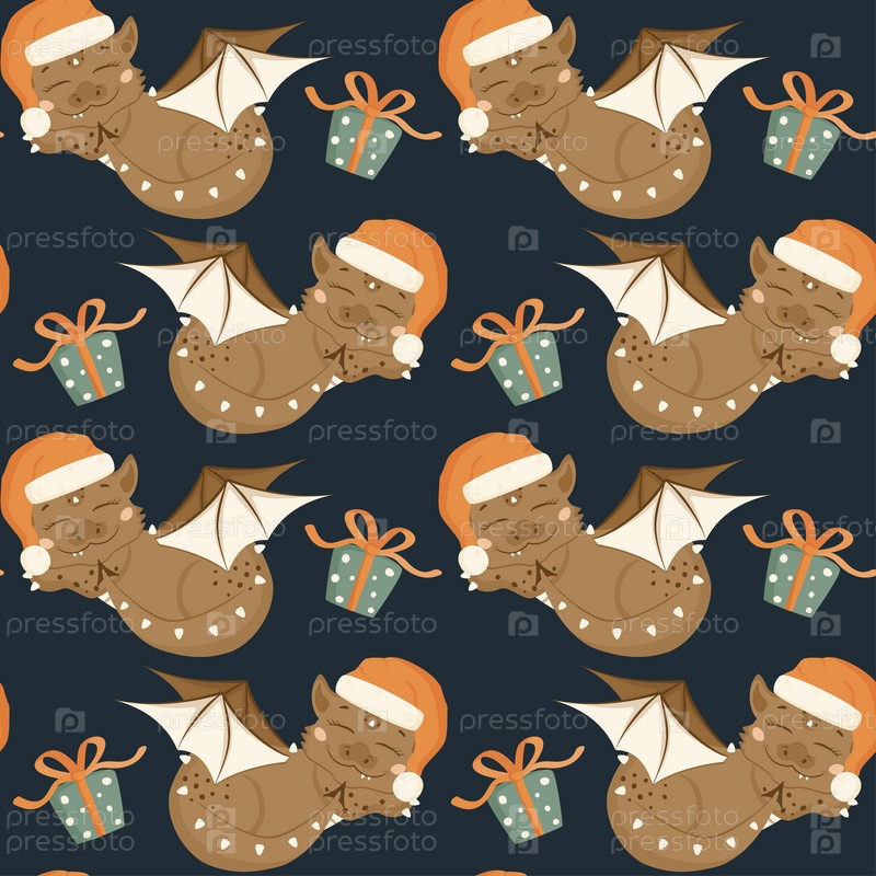 Бесшовный узор с милым спящим драконом в шапке Санта-Клауса в мультяшном стиле