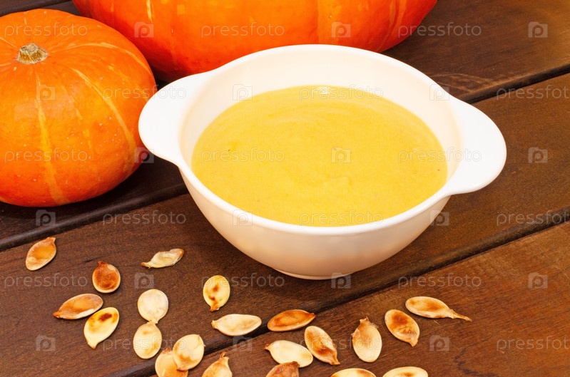 Горячий тыквенный суп-пюре на деревянном столе