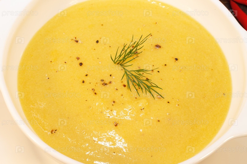 Тыквенный горячий суп-пюре и тыквы на деревянном столе
