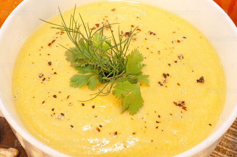 Тыквенный горячий суп-пюре и тыквы на деревянном столе